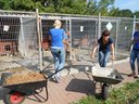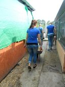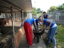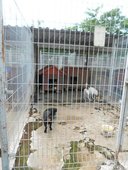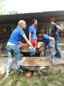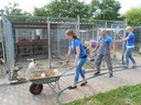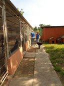 Wir begannen unsere Fütterungsrunde zunächst ohne Jejek, da dieser noch mit einer Vermittlung zugange war. Alle Hunde bellten ganz aufgeregt und konnten es gar nicht erwarten, dass sie an der Reihe sind. Sie schlangen das von uns zusammengemengte Futter, welches eine Mischung aus Feucht- und Trockenfutter war, freudig schmatzend herunter. Zwischenzeitlich machten sich Andrea und Astrid ein Bild von den aktuellen Notfellchen, die sich in der Quarantänestation befanden. Irgendwann stieß Jejek zu uns und half Anne und mir bei der Fütterung, während meine Mama Moni und Chrissy die nächsten Schubkarren mit Futter füllten.