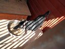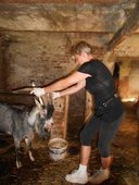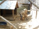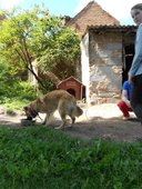 Wieder waren wir auf dem Hof, auf dem 9 Hunde leben - 7 davon an der Kette. Einige sind total von ihrer Umwelt abgeschottet, leben hinter Büschen und Heuhaufen. Sie sehen nichts, hören nur das Gebell ihrer Freunde und den Verkehr auf der nahegelegenen Straße. Auch besuchten wir wieder den Hof, wo die Kühe in einem dunklen Backsteinhaus, an kurzen Ketten stehen. Auch dort versorgten wir die Tiere und versuchten ihnen mit Streicheleinheiten, Leckerbissen und ein paar warmen Worten, ein paar schöne Minuten zu schenken. Diesmal verpflegten wir sogar einen Ziegenbock der in einem dunklen Stall an einer kurzen Kette stand. Wir brachten ihm ein paar Karotten, die er sofort wegschnurpselte. Andrea packte ihn dann beherzt an den Hörnern und Astrid verlängerte ihm seine Kette, damit er mehr Bewegungsfreiraum hat.