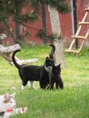 Am Pfingstsonntag, 19.05.13 besuchten wir, nachdem wir uns kurzfristig in Polen verfahren hatten und an einer Stelle mehrmals im Kreis gefahren sind (nein, an uns hat es nicht gelegen, das Navi war nicht auf dem neuesten Stand ;)), als erste Station „Fallada“, die Pferdeherberge mit den überwiegend vor dem Schlachttransport geretteten Pferden. Zusätzlich werden hier derzeit auch schätzungsweise 50 – 60 Hunde beherbergt und ein einzelner schwarzer Hofkater wacht dort über alle J. Sämtliche Pferdespenden wurden hier von uns übergeben und dann ging es auf die Weide zum „Pferdeschmusen“. Julia, unsere Pferdenärrin, hat sich besonders ins Zeug gelegt und viele Küsschen kassiert. Nach einem vegetarischen Buffet und selbstgebackenem Kuchen zur Stärkung, machten wir uns im Konvoi mit den anderen Besuchern bzw. Tierpaten der Pro Animale Tiere auf den Weg zur zweiten Station „Spartacus“. Hier leben überwiegend alte, kranke und auch blinde Pferde, 2 Schweine und auch jede Menge Katzen. Diese haben mehrere Außengehege wo sie sich, wenn sie möchten, aus dem Weg gehen aber auch, wie man an den beiden entzückenden schwarzen Schmusern erkennen kann, miteinander „köpfchengeben“, toben oder spielen können J Nachdem wir auch hier eine Weile alle Tiere bekuscheln durften, ging es weiter zur dritten Pro Animale Herberge „Sussita Kumi“. Hierauf habe ich mich schon ganz besonders gefreut, denn es ist die liebevoll errichtete Katzenstation wo ca. um die 100 Katzen in einem wunderschönen zweistöckigen Haus leben. Die dicken Säulen innen sind großzügig mit Sisal umwickelt und es gibt einen schönen Kachelofen auf dem mehrere Samtpfoten Platz finden. Natürlich grenzt auch hier ein großes Außengehege an mit Bäumen zum klettern und jeder Menge Spiel- und Versteckmöglichkeiten. Dieser Station haben wir dann eure Katzenspenden übergeben, die sie, wie Katzen so sind, schon neugierig beschnuppert und ausprobiert haben. Anschließend fuhren wir noch zu einer weiteren Pro Animale Pferdeherberge nach Karpno wo die geretteten Pferde auf großen Weiden verweilen dürfen. Ich hab mich lieber etwas abseits gehalten, denn ich bin ehrlich, ich hab schon seit Kindheit an einen großen Respekt vor Pferden und diese hier waren riesig ;) Anschließend haben wir uns auf den Heimweg begeben, denn wir mussten ja noch die Hundespenden für den nächsten Tag in den Transporter laden. Gegen 23:30 Uhr waren wir dann mit vielen neuen Eindrücken zuhause.