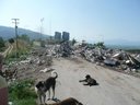 Dann führte uns unser Weg zu einem abgelegenen Grundstück. Einige laut bellende und sehr verängstigte Hunde umringten das Auto. Während Foteini diese mit Rufen und ein paar Leckerlies in Schach hielt, schlüpften wir drei in einen extra abgezäunten Bereich, in dem ca. 25 vermehrt zutrauliche Hunde (darunter auch einige Welpen) untergebracht waren. Wir setzen uns zu den Hunden und streichelten sie, während uns Foteini die Geschichten einzelner Hunde erzählte. Diese Hunde waren dort, um ausreisefertig gemacht zu werden. Foteini versucht mit einigen deutschen Tierschützern ein paar dieser Hunde in gute Familien nach Deutschland zu vermitteln. Fast alle von ihnen stammten ursprünglich von der nahegelegenen Müllhalde, die wir später am Tag noch besichtigen sollten.