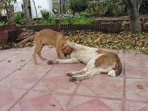 Am ersten Abend besuchten wir eine entzückende kleine Hündin, die ununterbrochen an der Kette gehalten wurde. Diese war jedoch so lang, dass einige Nachbarn ab und an durch den Zaun griffen und den Hund von der Kette los machten. So taten auch wir es an diesem Tag und fütterten die sehr liebenswerte Hündin mit ausreichen Feucht- und Trockenfutter. Am Abend fuhren wir zu einem örtlichen Supermarkt, um dort Futter für die kommenden Tage einzukaufen. Dabei stießen wir auf drei Straßenhunde auf dem dortigen Parkplatz, die wir sofort mit Futter und Wasser versorgten. Einer der Hunde war sehr zutraulich, die anderen beiden hielten sich lieber auf Abstand.