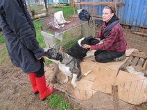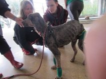Zuerst fuhren wir mit den Frauen in die städtische Tierklinik. Dort waren zu diesem Zeitpunkt vier der Tiere aus Vassos Tierheim zur Behandlung untergebracht. Einer davon war der Rüde Fantomas, den wir schon zuvor auf Bilder gesehen hatten. Ein Hund der bei seiner Übernahme durch Vasso mehr tot als lebendig war und noch immer auf der Kippe stand. Er bestand nur aus Haut und Knochen und an Stelle von Fell hatte er Schorf überall auf seinem Körper. Wir durften alle vier Hunde kurz nach draußen holen und ihnen ein paar Streicheleinheiten schenken. Diese genossen sie doch sehr! Zwei der Hunde konnten an diesem Tag entlassen werden und so luden wir sie ein und fuhren weiter zu einem Tierarzt, bei dem Vasso regelmäßig einige ihrer Tiere behandeln lässt.