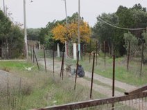 Einige Gehminuten weiter trafen wir dann auf unser nächstes Sorgekind, dass uns den Rest der Reise noch sehr viele Nerven kosten sollte. Wir kamen an ein unbebautes Grundstück, auf dem neben einem Haufen Kies nur Wiese zu sehen war. Auf diesem Grundstück saß ein sehr magerer Hund, der mit einer schweren Kette an eine Laufleine befestigt war. Völlig unbedarft gingen wir an den Zaun und ich streichelte den Hund einige kurze Male. Dann packten wir das mitgebrachte Futter aus und begannen den Hund zu füttern. Dabei begann er uns anzuknurren und nach Kostas Fuß zu schnappen, der ihm das Trockenfutter etwas näher heran schieben wollte. Wir traten lieber ein paar Meter zurück, denn plötzlich war mit diesem Hund nicht mehr zu spaßen. Ich ging an dem Zaun entlang und sah die “Hütte“ die man diesem armen Kettenhund aufgebaut hatte. Bretterverschlag wäre noch ein zu blumiger Begriff dafür. Zwei Europaletten waren aufgestellt und mit etwas Plane überhangen worden. Ein Gebilde, das dem Hund weder Schutz vor Wind, noch vor Kälte oder Regen bieten konnte. Später dann bemerkten wir zudem, dass die Kette des Hundes so kurz war, dass es ihm nicht mal gelang in diesem “Unterstand“ Schutz zu suchen.
