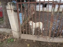 Anschließend gingen wir erneut zu unserem Sorgenkind um ihm etwas Feuchtfutter und frisches Wasser zu bringen. Als wir am Zaun ankamen und begannen das Futter vorzubereiten, kam der Hund sogleich an den Zaun gelaufen. Doch nicht nur das, es gab eine Lücke im Zaun, die es ihm ermöglichte, darunter hindurch zu schlüpfen und 1 Meter auf den Gehweg zu laufen. So stand er uns direkt gegenüber und bellte lauthals. Wir gingen zwei Meter zurück und schoben ihm die Schale mit dem Futter aus sicherer Entfernung zu. Einige Meter weiter hinter ihm hoben wir einen Eimer mit Wasser auf das Grundstück. So nah an ihn heran, dass er ihn erreichen würde. Wir blieben einige Minuten stehen und beobachteten, wie er das Futter in sich hinein schlang. Immer wenn wir ihm auch nur ein paar Zentimeter näher kamen, begann er zu knurren und zu bellen. Als er fertig war, zog Kosta mit einem Stock die Schale zurück. Das gefiel dem Hund gar nicht, er biss in den Stock und machte großen Lärm dabei. Wir gingen um die Ecke und warteten, bis er wieder auf dem Grundstück war und begann sich über das frische Wasser her zu machen.