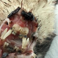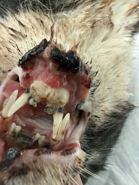 Vio hat mir gestern Abend diese Bilder eines Katers geschickt, den sie neulich gefunden haben. Er lebt offenbar schon lange auf der Straße und wurde irgendwann auch mal angefahren. Die Verletzungen davon sind schon älter und noch nicht mal die Schlimmsten. Seine Zähne waren in einem so katastrophalen Zustand, dass der arme Kerl praktisch kaum mehr fressen konnte. Er ist völlig abgemagert und dehydriert.