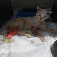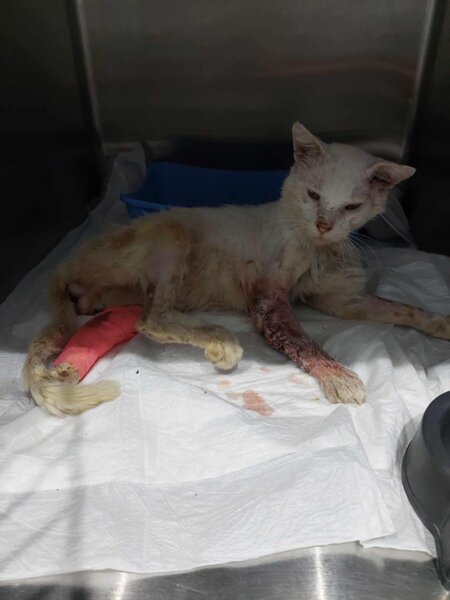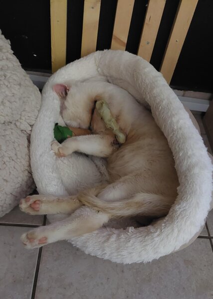 Das ist Cloud (Wolke) aus Raffina. Cloud wurde vor etwa 2 Jahren in einem Katzenkorb gefunden. Alle vier Beine waren gebrochen und Cloud musste 5 OP's über sich ergehen lassen, bis seine Beine einigermaßen verheilt waren.